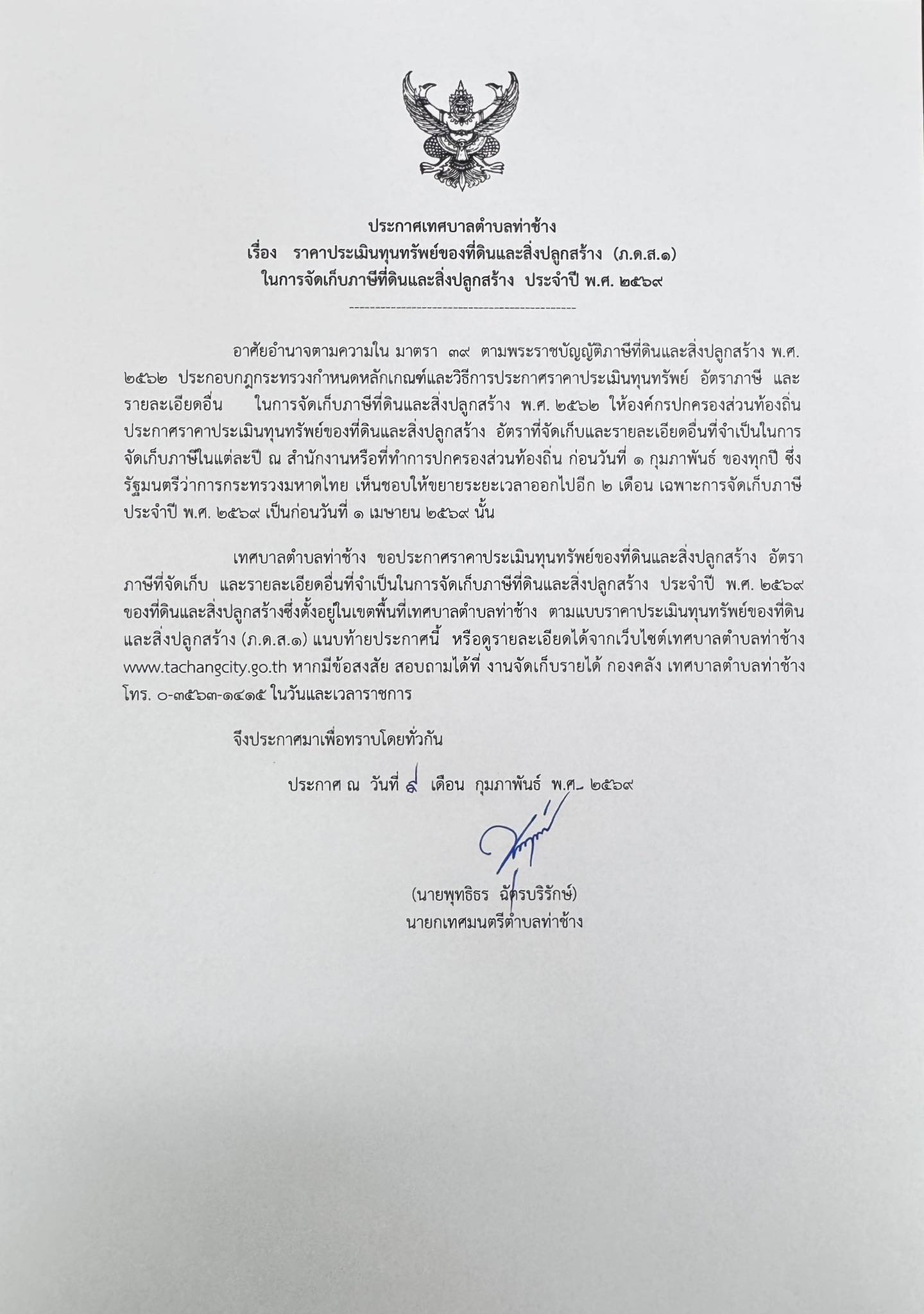 ประกาศ การขยายกำหนดเวลาดำเนินการตาม พรบ.ภาษีที่ดินและสิ่งปลูกสร้าง พ.ศ. 2562 ประจำปี พ.ศ.2568 |